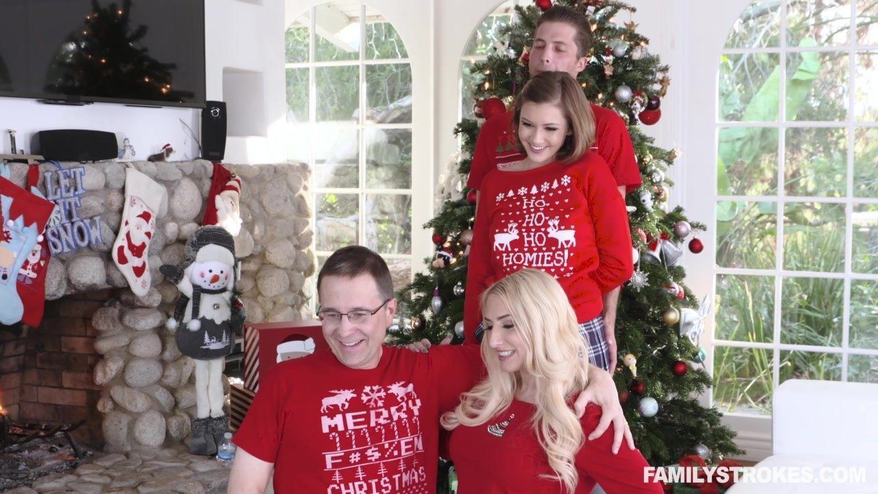 Семейная рождественская фотосессия в красных свитерах, заканчивается для юной сводной сестры в юбочке сексом с братом у ёлки. Они возбуждены и жарко трахаются, успевая кончить до прихода матери.